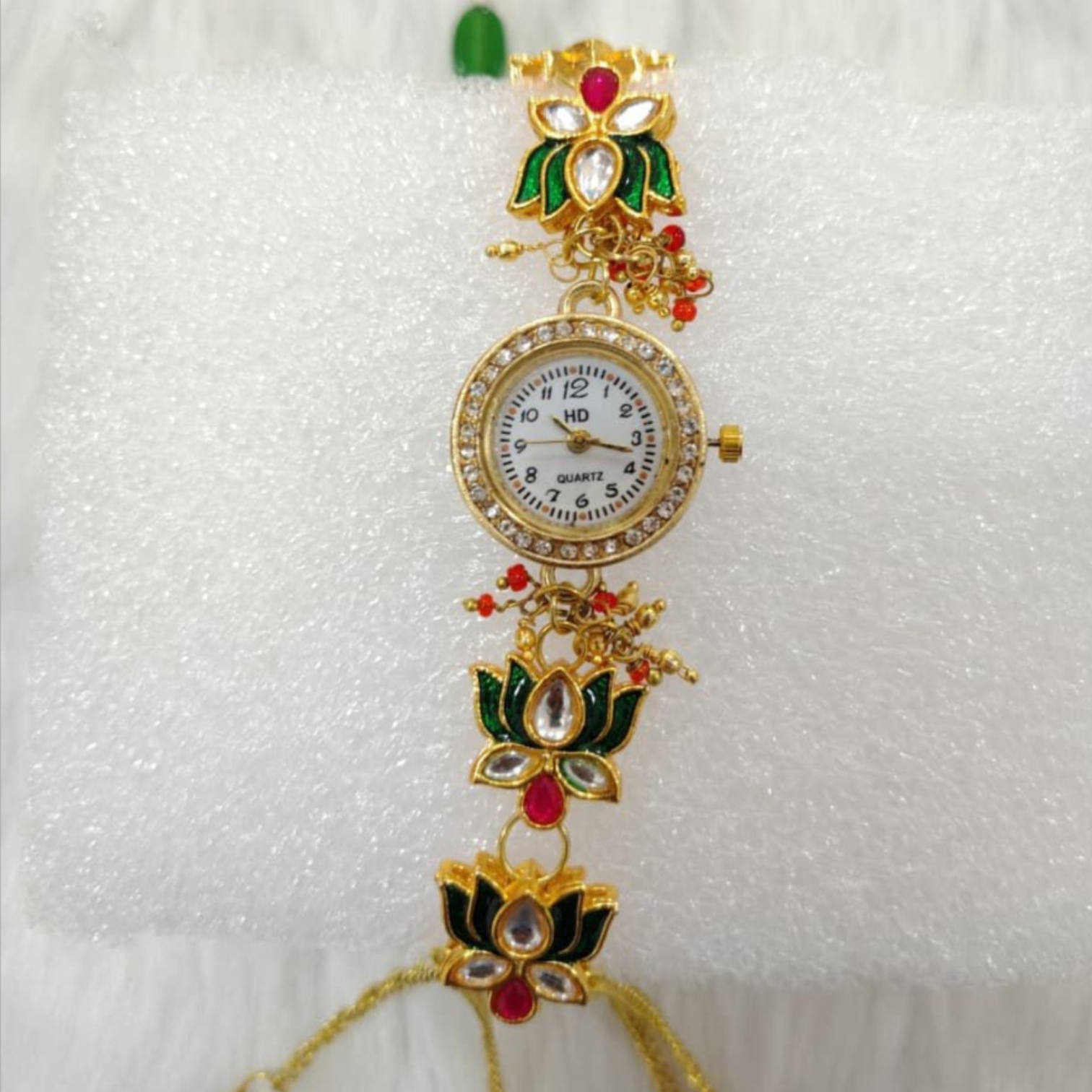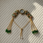 Add a touch of elegance to your ethnic style with this lotus design bracelet watch featuring beautiful green and red stone detailing. Crafted with gold plating, this jewelry-style wristwatch blends tradition with functionality. Perfect for weddings, festivals, and special occasions, it offers a lightweight and comfortable fit for all-day wear. A stylish and unique accessory, this watch is also a great gift choice for women who love classic ethnic fashion.