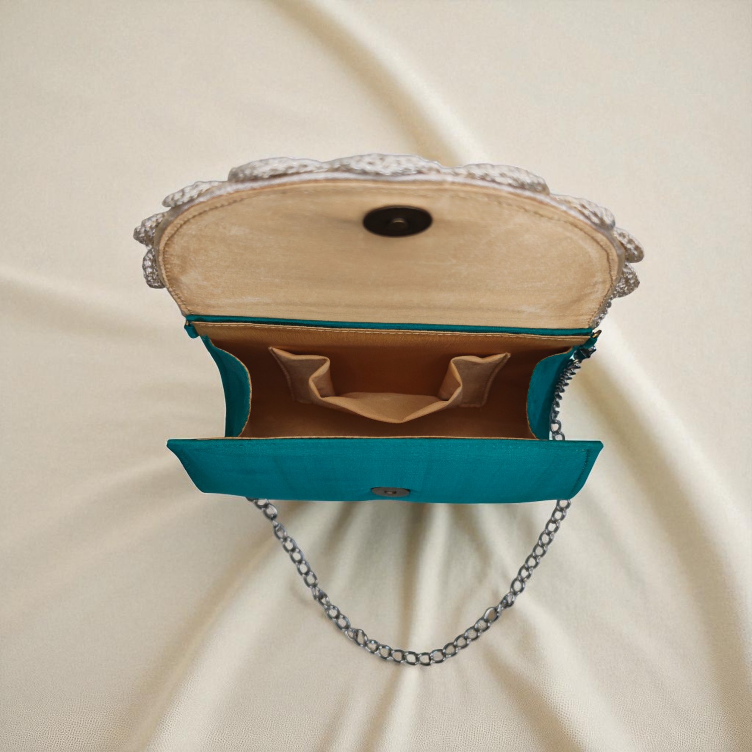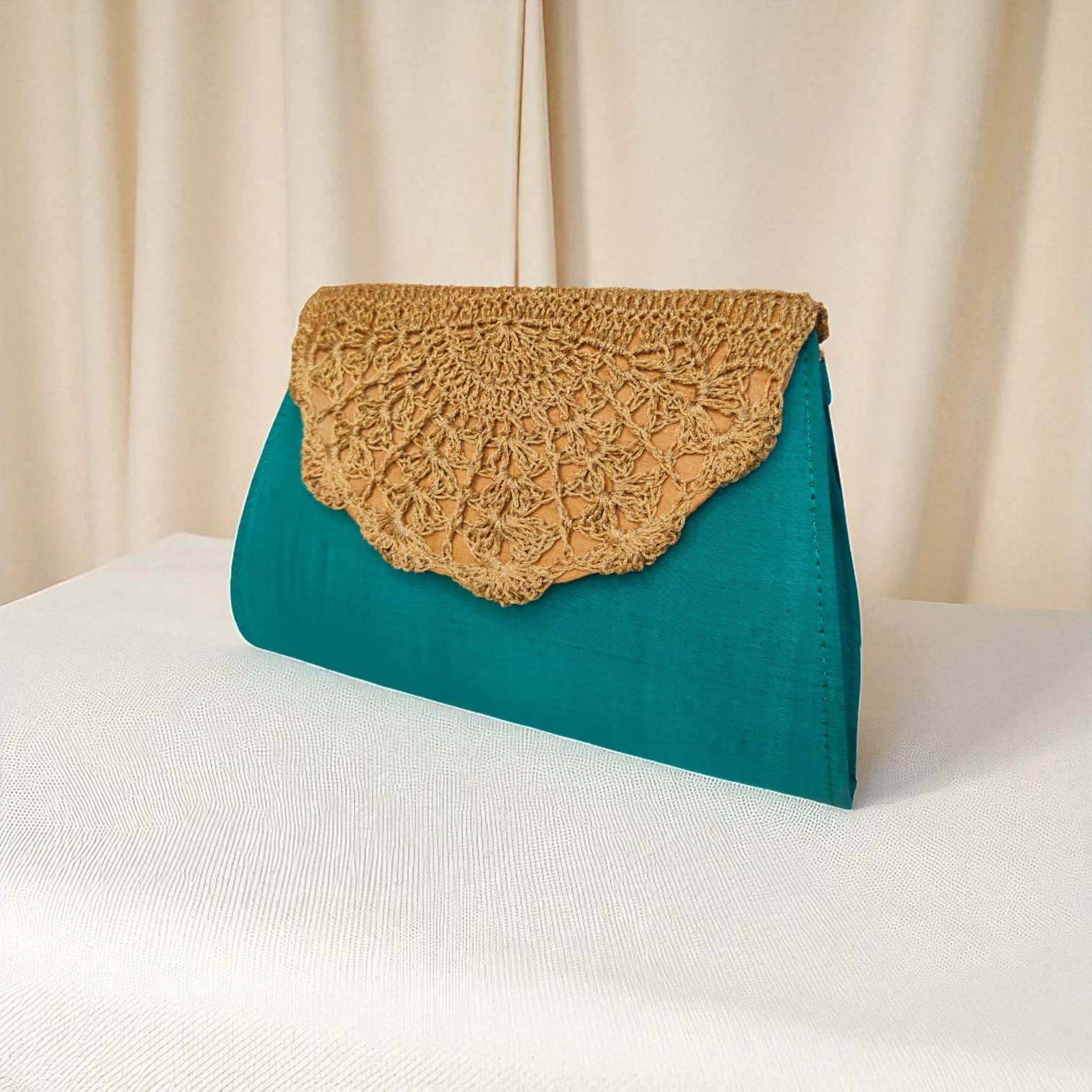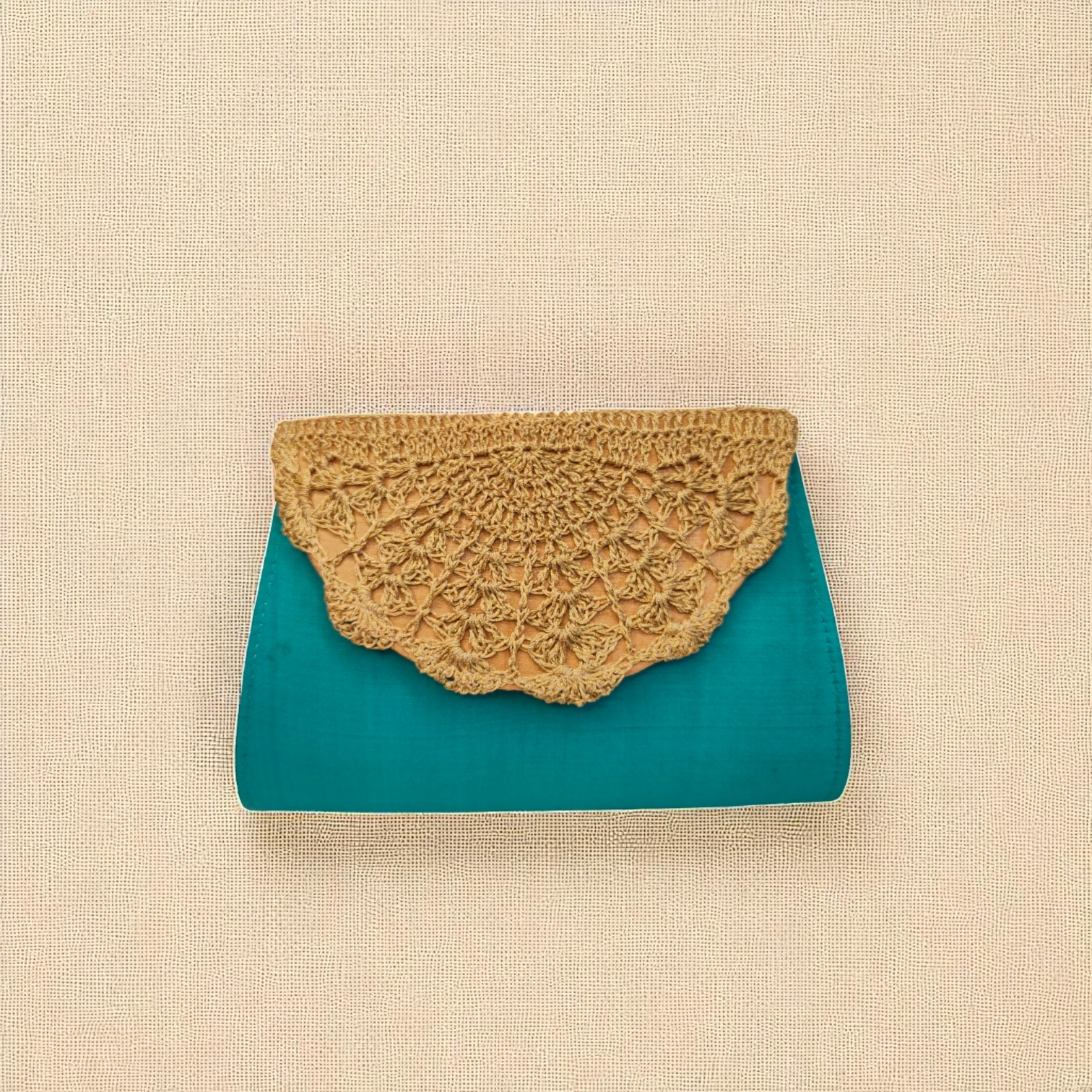 Add charm to your look with this Handmade Crochet Flap Clutch in teal, beautifully detailed with mustard lace. Designed for parties, weddings, and evening outings, this elegant bag blends traditional crochet artistry with modern style. Its spacious interior keeps your essentials organized while the handcrafted lace flap adds sophistication. Lightweight, stylish, and versatile, this evening clutch is the perfect accessory for women who appreciate unique, handmade fashion with a timeless appeal.