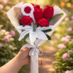 This handmade crochet flower bouquet features beautifully crafted red roses paired with an elegant white lily, wrapped in premium decorative paper. Thoughtfully knitted with care, it offers a long-lasting, eco-friendly alternative to fresh flowers. Perfect for Valentine’s Day, anniversaries, birthdays, or home décor, this reusable bouquet adds charm and warmth to any space while expressing love that never fades.