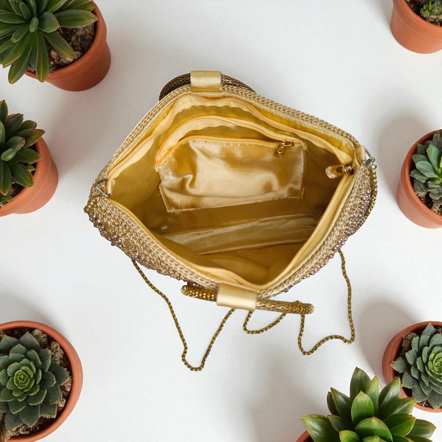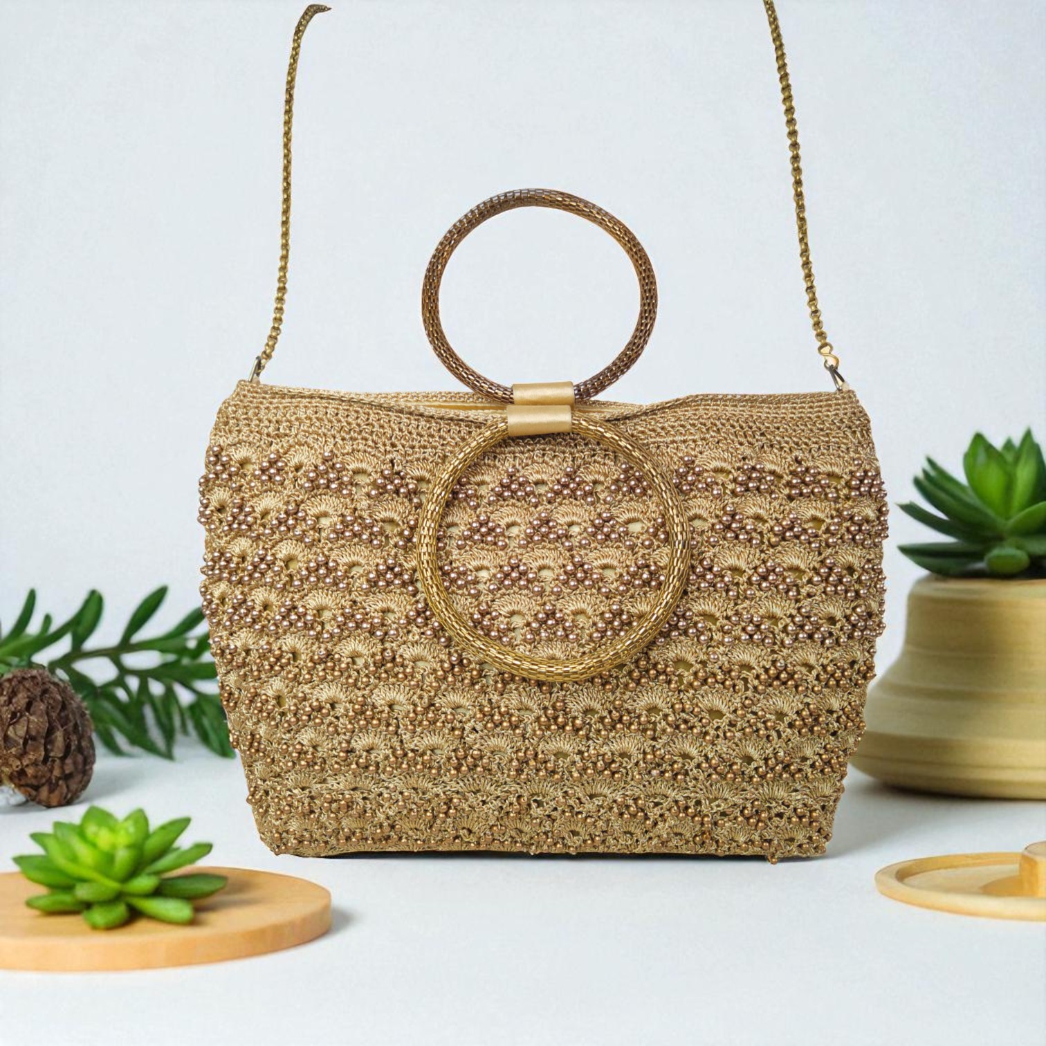 Make a glamorous statement with this Handmade Golden Crochet Clutch Bag. Featuring intricate crochet work, a chic metallic finish, and a unique ring handle, this stylish evening purse is perfect for parties, weddings, and festive occasions. The detachable chain strap adds versatility, allowing it to be carried as a clutch or sling bag. Lightweight yet elegant, this handcrafted accessory is ideal for women who love luxury, boho charm, and timeless fashion.