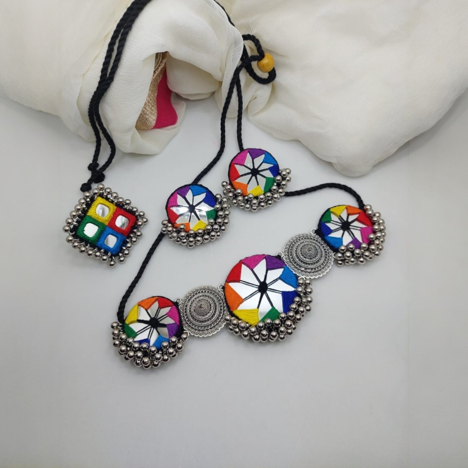 Bring vibrance to your look with this Handmade Multicolor Mirror Work Necklace with Earrings Set. Featuring colorful embroidery, round mirrors, and antique silver bead detailing, this tribal boho ethnic jewelry set is perfect for weddings, festivals, parties, and casual outings. Lightweight yet eye-catching, it pairs beautifully with sarees, lehengas, kurtis, and Indo-western outfits. A unique handcrafted jewelry set designed for women who love bold, traditional, and artistic accessories.