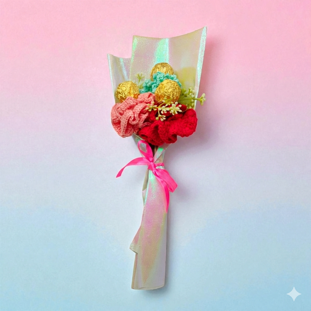 Celebrate Raksha Bandhan with this handmade bouquet, specially crafted for your sister. Featuring vibrant crochet scrunchies, delicious chocolates, and a festive Rakhi greeting card, it’s the perfect blend of love and creativity. Thoughtfully wrapped in pastel shimmer paper with a cute pink ribbon, this unique gift is ideal for expressing affection and appreciation. Surprise your sister with this beautiful Raksha Bandhan gift that’s sweet, stylish, and memorable.