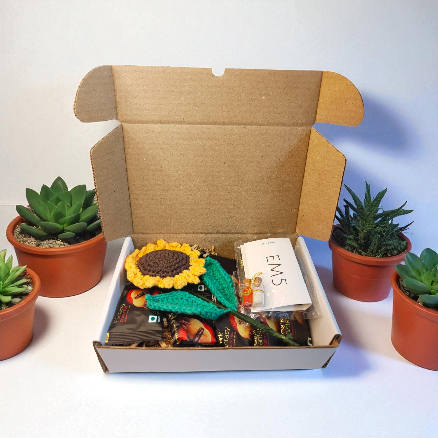 Celebrate Raksha Bandhan with this unique Handmade Sunflower Rakhi Gift Hamper for your brother. Featuring a beautifully crafted crochet sunflower rakhi, premium dark fantasy chocolates, roli-chawal, and thoughtful accessories, this gift box blends tradition with creativity. Elegantly packed, it’s a perfect Rakhi gift to express your love and appreciation. Make your brother feel extra special with this charming Raksha Bandhan hamper, designed to create lasting memories and festive joy.