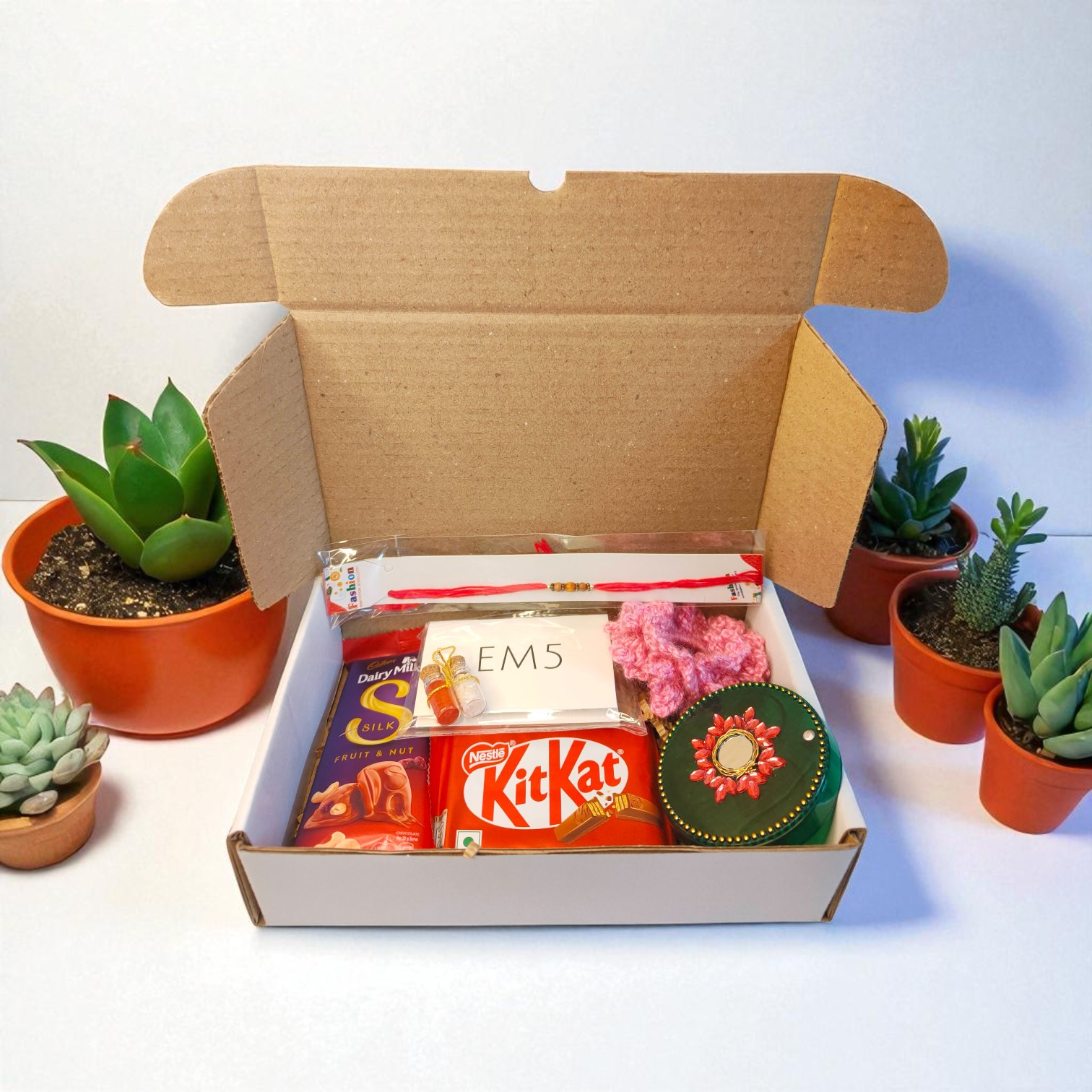 Celebrate Raksha Bandhan with this Premium Rakhi Gift Hamper, thoughtfully curated for your brother. The box includes a handmade Rakhi, Dairy Milk Silk, KitKat, roli-chawal, essential oil, and festive accessories, beautifully packed for a memorable surprise. Perfect for showing love and appreciation, this Raksha Bandhan gift box is ideal for brothers of all ages. Make the occasion extra special with this elegant and delicious Rakhi hamper filled with joy and tradition.