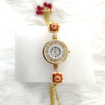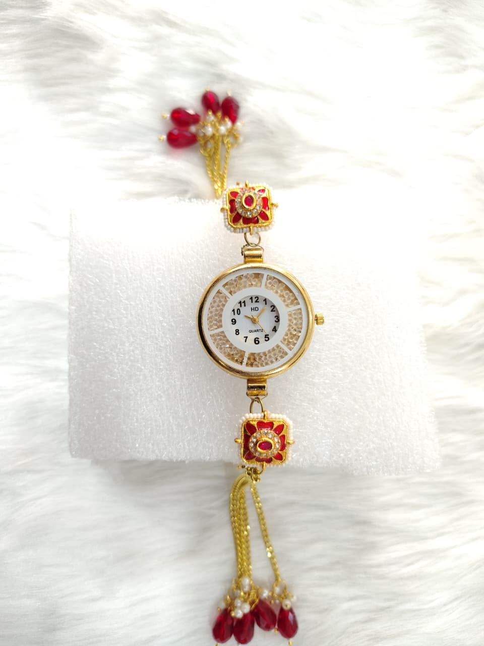 Elevate your ethnic look with this stunning hathphool style bracelet watch featuring elegant gold plating and rich red stone detailing. Designed like traditional hand jewelry, it beautifully blends style and functionality, making it perfect for weddings, festivals, and special occasions. The adjustable chain ensures a comfortable fit while adding a graceful touch to your attire. A unique and eye-catching accessory, this watch also makes a perfect gift for women.