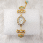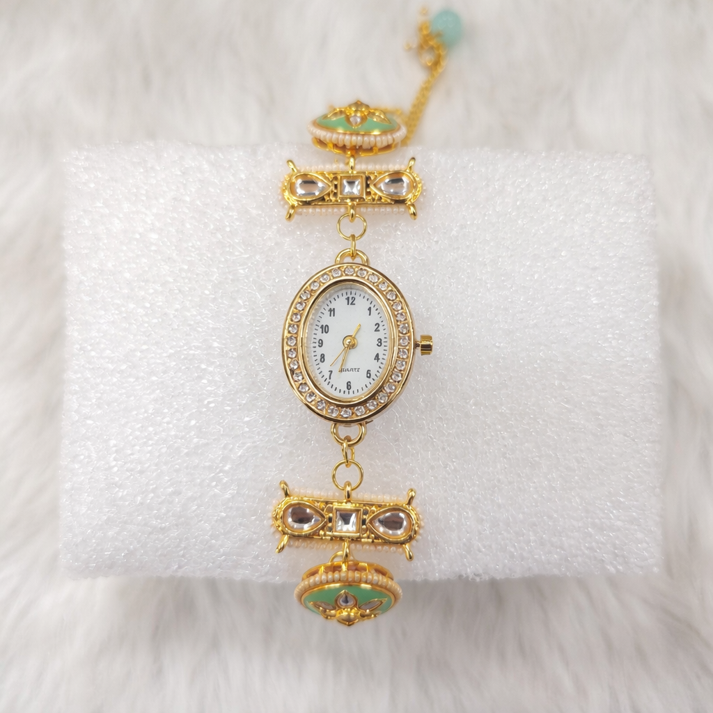 Add elegance to your ethnic look with this mint green Kundan hathphool bracelet watch featuring intricate stone work and pearl detailing. Designed like traditional hand jewelry, it offers a perfect blend of style and functionality. Ideal for weddings, festivals, and special occasions, this lightweight piece ensures comfortable wear while enhancing your outfit. A unique and graceful accessory, it also makes a beautiful gift choice for women who love ethnic fashion.